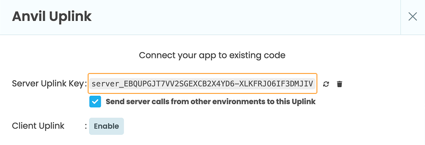 If you have multiple environments, you’ll see a list of them. Select the environment you want to connect the Uplink to, then click Enable next to either Server Uplink Key or Client Uplink Key (learn about the difference).