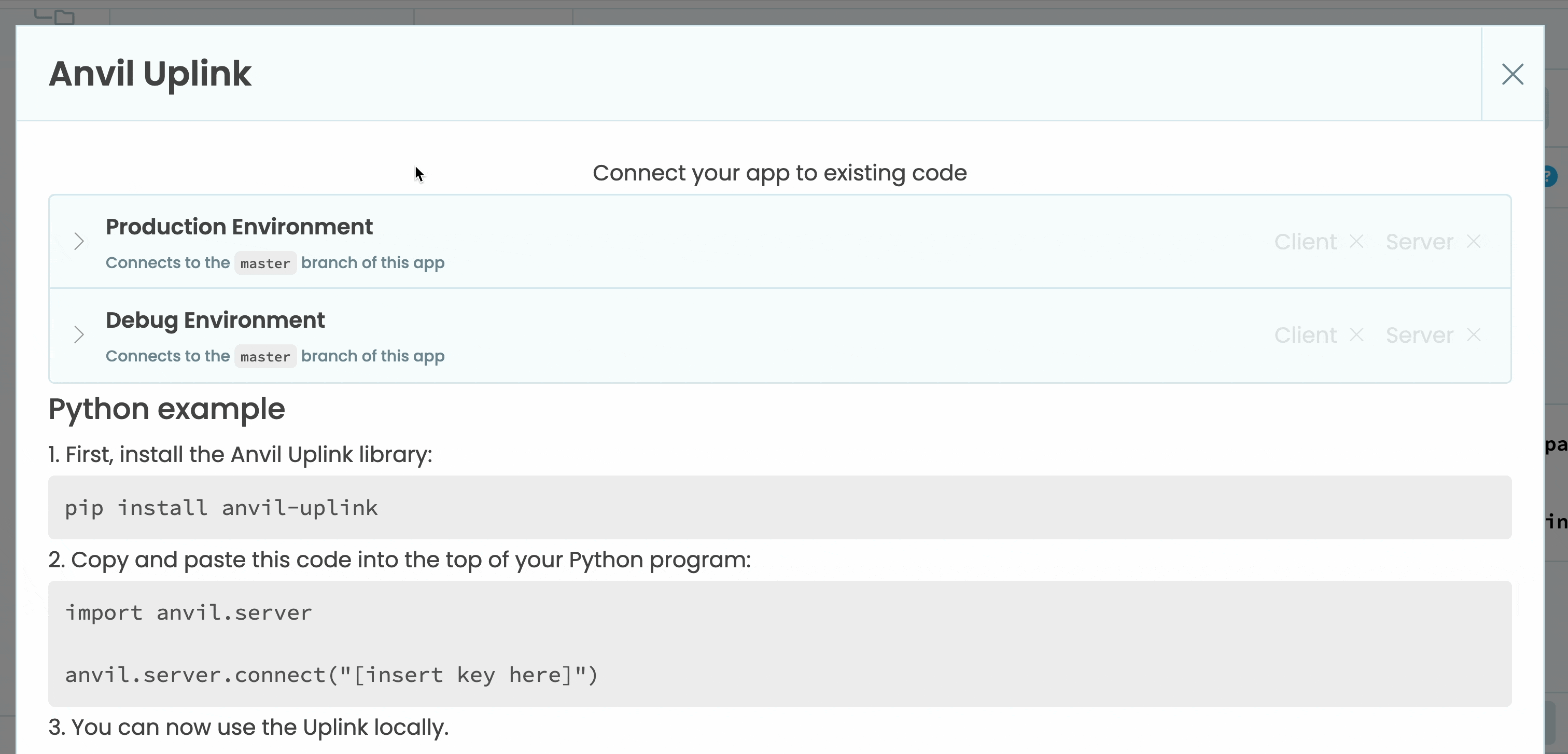 In your local Python code, call anvil.server.connect() with your app’s connection key in order to link this program with your Anvil app. This establishes a connection in a background thread and will keep attempting to reconnect to Anvil if it fails (for instance, if you lose your local internet access temporarily).