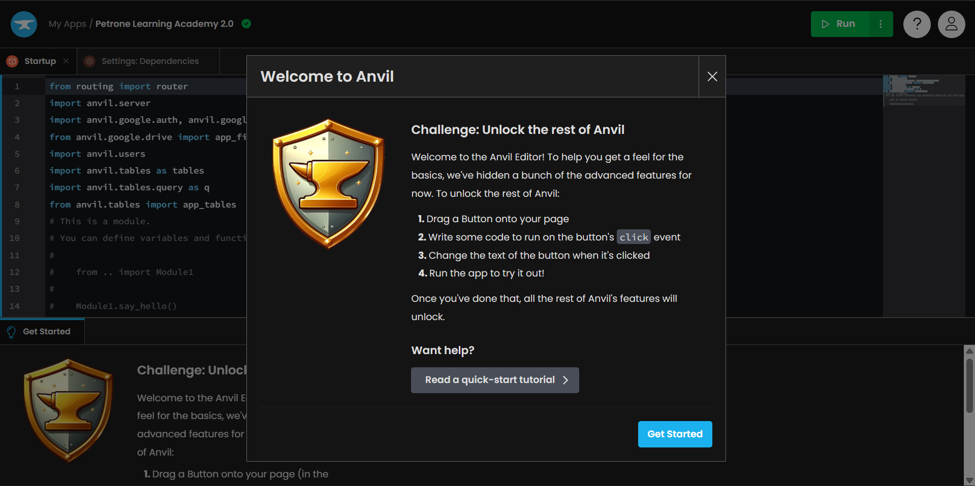 Whenever I try to add a form/module/package from the UI, the following screen appears, hiding all the navigation and everything. It is not letting me go anywhere, and the only escape I have is to refresh the URL or go back to anvil.works landing page.