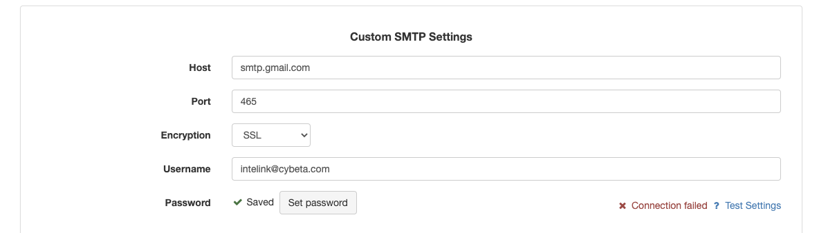 For the host, I enter smtp.gmail.com. The email settings for gmail indicate that SSL runs on port 465, as is shown in the example above. When I enter my email address in the username field (not… "accounts"@domain.com… enter a validated/verified passworkd, and test settings, the connection fails. nothing I do anywhere is working.
