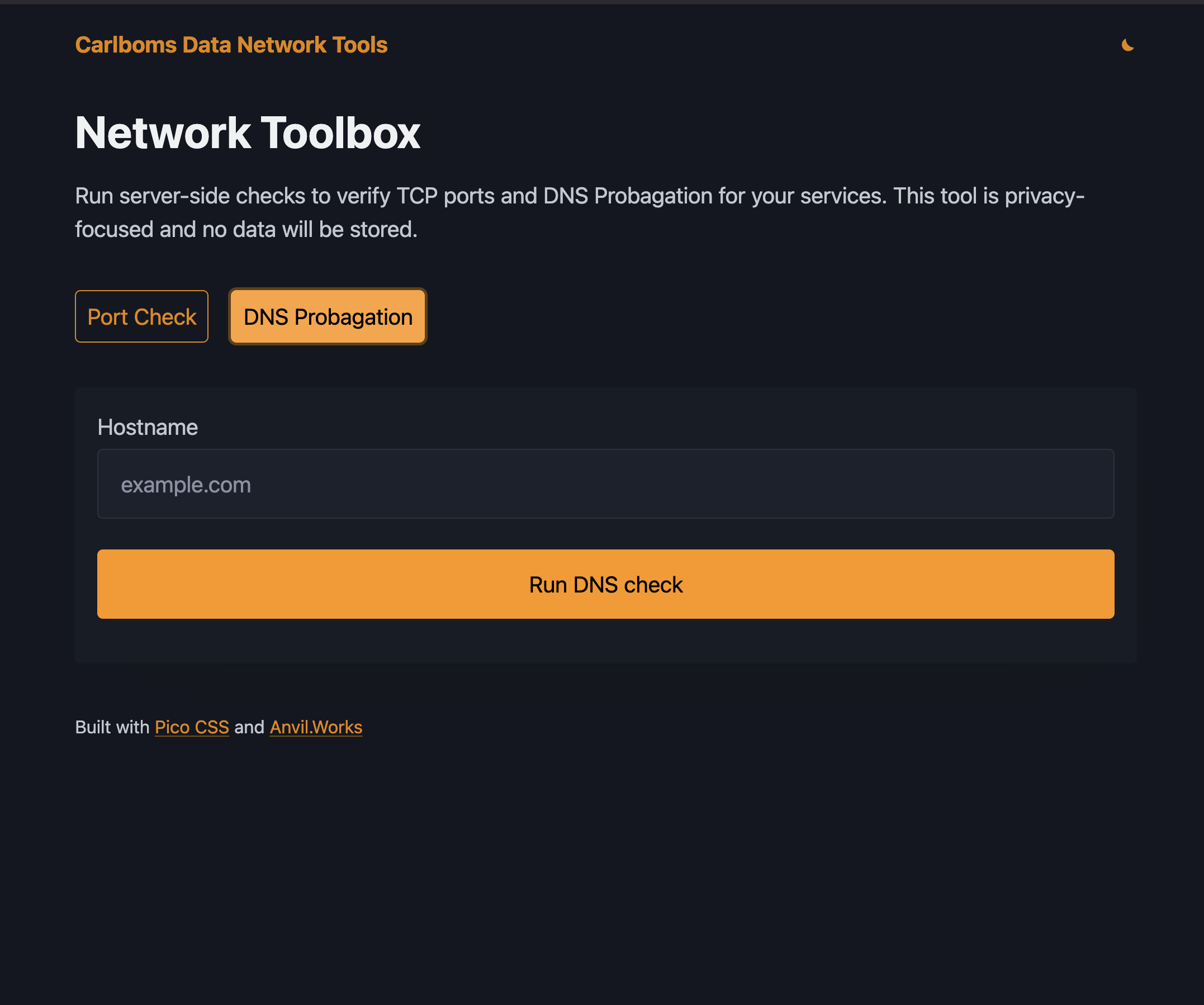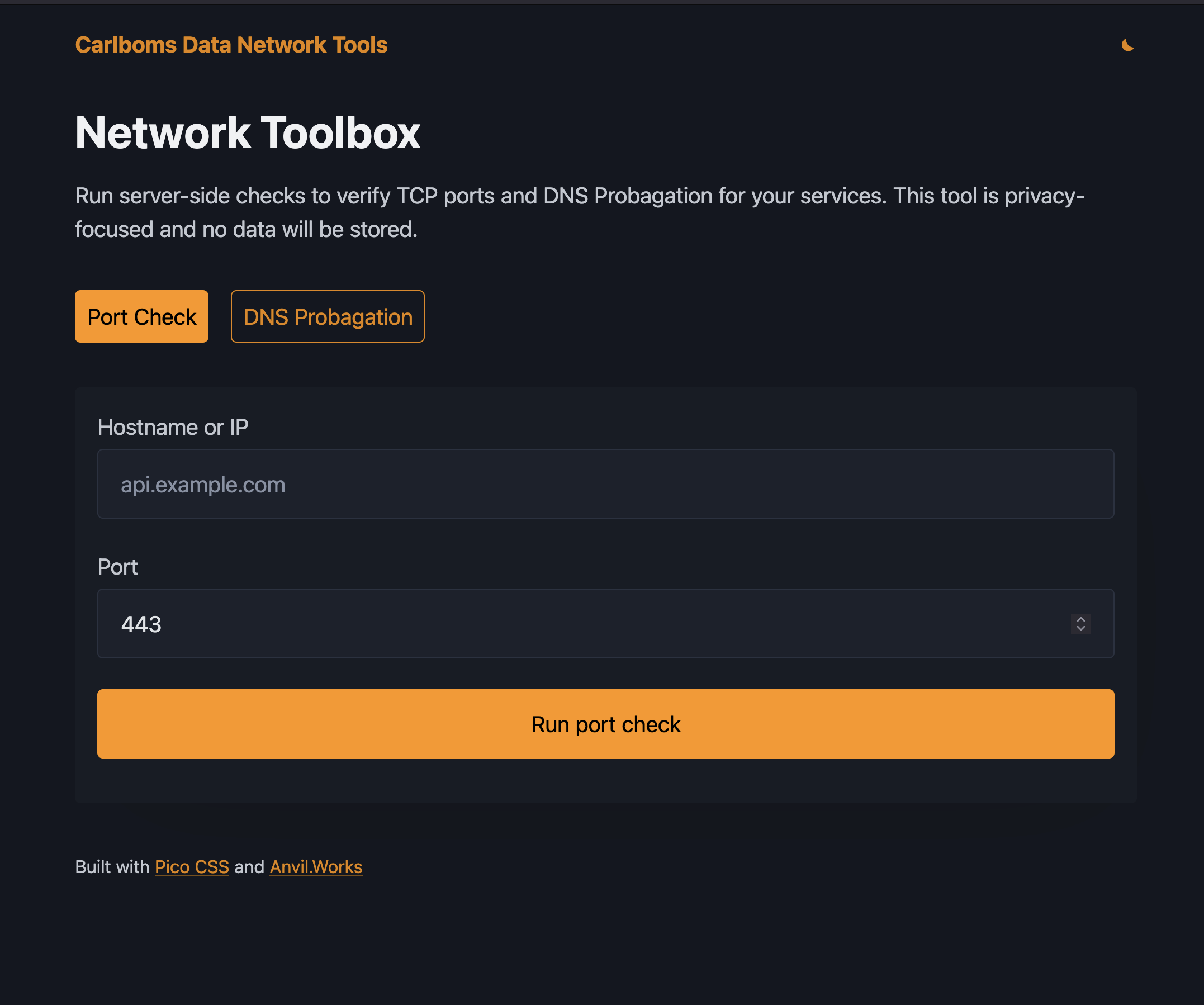 I just want to share a small network tools application that uses custom html inside Anvil with Pico CSS framework.
