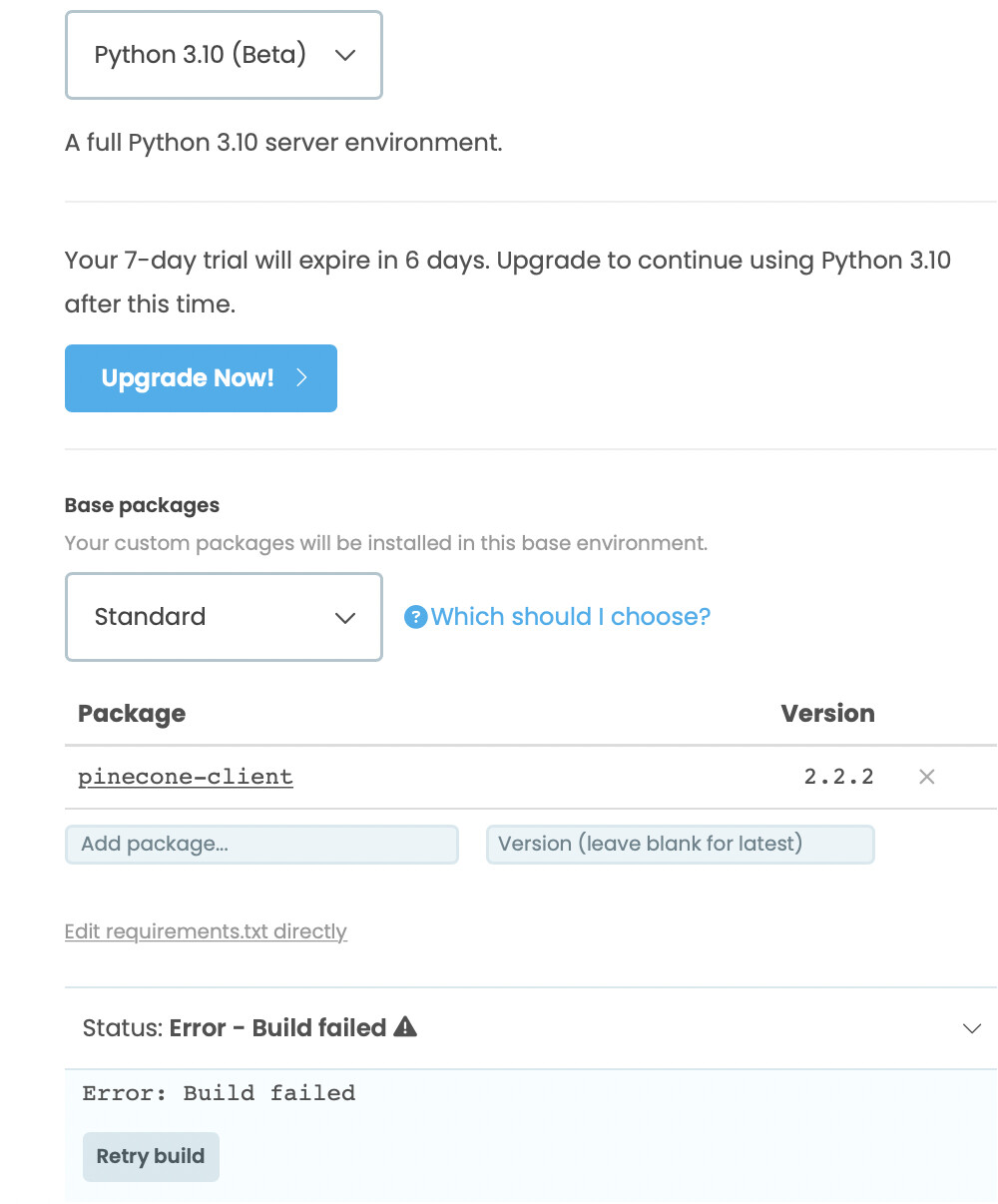 Trying to add pinecone-client as custom package, it doesn’t build. Retried multiple times with different versions. Screenshot: